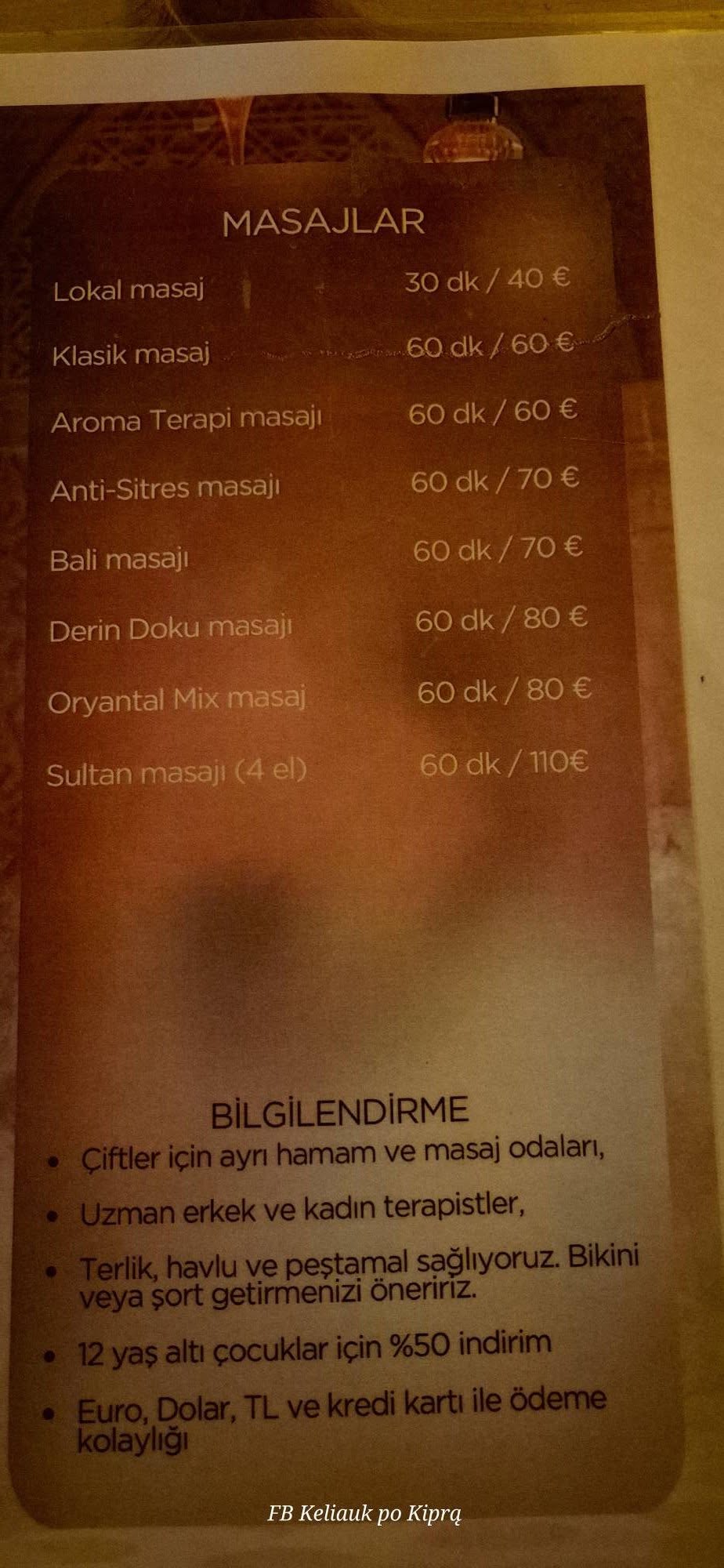 Noriu pasidalinti įspūdžiais iš Nikosijos Šiaurės Kipro pusės hamamu. Išvyką organizavo lietuvė mergina, prisijungiau su Irmute Pajaujyte ,nes kas gi daugiau, jei ne profesionalas gali įvertinti masažų kokybę po pirties. Patogu patekti iš Pietų Kipro Ledra gatve. Mes pasirinkome su nakvyne, bet jei atvažiuoti iš ryto, nakvynė nebūtina. Jaukumas viduje ir rami muzika. Tyliai aptarnaujantis personalas pasiūlo vandens, arbatos. Administratorius pasidomi ar gali maudyti ir daryti masažą ir vyrai ar tik moterys. Šiuo metu yra trys dirbančios moterys ir du vyrai. Vienas turkas dirbantis čia jau 20 metų, Irma pasirinko jį, kad galėtų įvertinti masažo kokybę. Man buvo paskirtas iš Balio. Merginos gavo po turke ir balietę, nes jos tik hamamo procedūras ėmė.
